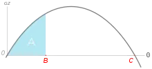Если обратиться к диаграмме статической остойчивости, работа выражается площадью под кривой восстанавливающего момента mв. Соответственно, динамический угол крена θдин можно определить из равенства площадей OAB и BCD, соответствующих избыточной работе восстанавливающего момента. Аналитически та же работа вычисляется как: