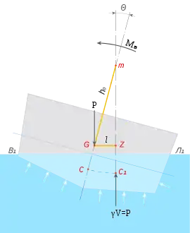 Центр тяжести G при таком наклонении не меняет своего положения, а центр величины (ЦВ) С как центр тяжести погруженного объёма перемещается по некоторой кривой СС1 в сторону наклонения и занимает новое положение C1. Перемещение центра величины происходит вследствие изменения формы погруженного объёма: с левого борта он уменьшился, а с правого борта увеличился. Сила плавучести γV, приложенная в центре величины, направлена по нормали к траектории его перемещения.