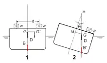 В результате смещения ЦВ при наклонении линии действия силы веса и силы плавучести смещаются и образуют пару сил. Если плечо пары положительно, возникающий момент mв действует в сторону восстановления равновесия, то есть спрямляет. Тогда говорят, что судно остойчиво. Если ЦТ расположен выше метацентра, момент может быть нулевым или отрицательным, и способствовать опрокидыванию — в этом случае судно неостойчиво.