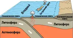 Островные дуги — цепочки вулканических островов над зоной субдукции, возникающие там, где одна океаническая плита погружается под другую.