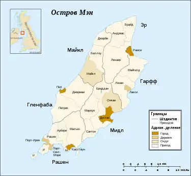 Остров Мэн делится на 24 административных района (districts). Районы делятся на три категории[16]: