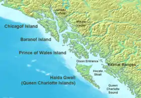 Расположен к северу от острова Баранова. Омывается с востока проливом Чатем, с севера — проливом Айси-Стрейт, с запада — Аляскинским заливом, с юга — Перилским проливом.