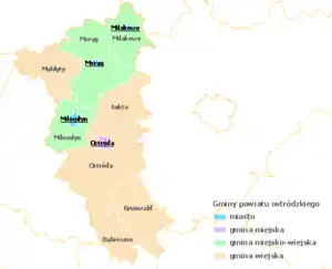 - городско-сельские гмины: Гмина Милаково, Гмина Миломлын, Гмина Моронг