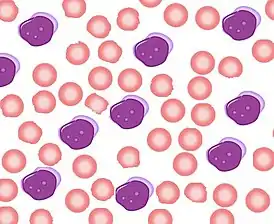 ![]() Фотография, показывающая, как выглядит ОМЛ с минимальной дифференциацией (подтип M0) под микроскопом. В бластах отсутствуют тельца Ауэра. | |