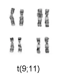 Специфические цитогенетическиеотклонения обнаруживаются у многих больных ОМЛ. Виды изменений хромосом часто прогностически значимы.[28] Хромосомные транслокации кодируют синтез гибридных белков, чаще всего, факторов транскрипции — вспомогательных белков — помощников РНК-полимераз, изменённые свойства которых могут привести к останову дифференциации.[29] Например, при остром промиелоцитарном лейкозе транслокация t(15; 17) вызывает синтез гибридного протеина PML-RARα, который связывается с рецептором ретиноевой кислоты в промоторах некоторых специфических для миелоидных клеток генов и останавливает в этих клетках дифференциацию.[30]