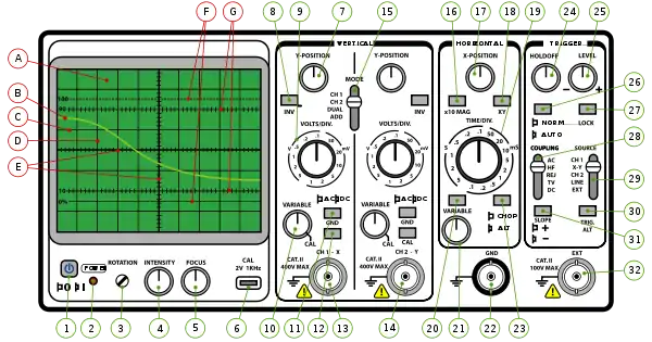 Осциллограф имеет экран A, на котором отображаются графики входных сигналов. У цифровых осциллографов изображение выводится на дисплей (монохромный или цветной) в виде готовой картинки, у аналоговых осциллографов в качестве экрана используется осциллографическая электронно-лучевая трубка с электростатическим отклонением. На экран с внутренней стороны колбы обычно нанесена координатная сетка.