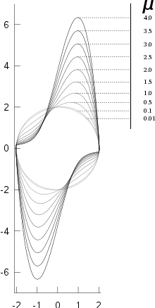 У осциллятора Ван дер Поля существуют два интересных режима: при и при . Очевидно, что третьего режима — — не существует, так как затухание в системе не может быть отрицательным.