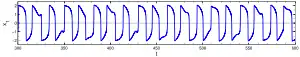 Осциллятор Ван дер Поля был предложен голландским инженером и физиком Бальтазаром ван дер Полем, во время его работы в компании Philips.[1] Ван дер Полем были найдены устойчивые колебания, которые были названы релаксационными,[2] известные как «предельные циклы» В сентябре 1927 года Ван дер Поль и его коллега ван дер Марк сообщили,[3] что на определенных частотах были зафиксированы шумы, всегда находящиеся рядом с собственными частотами волн. Это было одним из первых наблюдений детерминированного хаоса.[4]