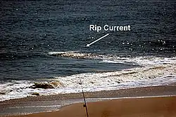 - Видимый канал бурлящей воды, поперечный берегу; впрочем, бывает и наоборот: всюду волны, а между ними узкая полоса «спокойной» воды, без волн — это и есть область отбойного течения.