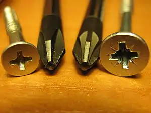 Также износ повышается при использовании неподходящих типа и размера отвёртки и крепежа. К примеру, вместо отвёртки с наконечником PZ2 для крепежа PZ2 используется отвёртка PH2 или PZ1. При правильном выборе наконечника он должен сидеть в головке крепежа без болтания.
