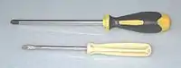 Отвёртка применяется чаще всего для манипуляций с винтами и шурупами, на головке которых имеется шлиц (паз). Обычно представляет собой металлический стержень с наконечником и рукояткой (пластмассовой или деревянной)[2]. ГОСТ 29308-92 «Инструмент монтажный для винтов и гаек. Номенклатура» относит к отвёрткам также некоторые виды ключей (ключи торцовые и ключи для круглых гаек с шлицем (шлицами) или отверстиями на торце) и сменные головки с внутренним и наружным зевом (по ГОСТ 25604-83 «Сменные головки. Типы и основные размеры»).