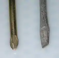 Наконечник отвёртки изнашивается из-за действия значительных механических напряжений в процессе работы. Для увеличения срока службы наконечника его изготавливают из специальных износостойких и прочных сплавов, например, из хром-ванадиевых -молибденовых сталей.
