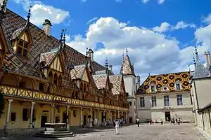 Отель-Дьё считается одним из шедевров бургундской средневековой готической архитектуры. Особо примечательны крыши, покрытые разноцветной черепицей четырёх цветов (красный, синий, жёлтый, зелёный), образующей геометрические узоры. Подобная полихромная черепица, вероятно, происходит из Центральной Европы, однако она настолько распространилась в Бургундии, что стала считаться традиционной именно для этой местности[5].