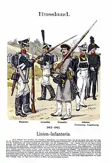 Оружейные заводы выпускали ежегодно 1200—1300 орудий и более 150 тысяч пудов бомб и ядер (ср.: французские заводы выпускали 900—1000 орудий). На Тульском, Сестрорецком и Ижевском оружейных заводах изготовлялось от 43 до 96 тысяч ружей в год[65], кроме того арсеналы могли отремонтировать почти такое же количество оружия[66], в то время как во всех французских заводах выпускалось около 100 тысяч ружей в год. Русское оружие того времени было относительно высокого качества и по тактико-техническим данным не уступало французскому. Тем не менее мощностей собственного российского производства не хватало для удовлетворения всех потребностей армии. Некоторые полки и даже дивизии были вооружены английскими или австрийскими ружьями[67]. Русская пехота была вооружена в основном гладкоствольными ружьями; некоторые стрелки имели нарезные штуцера или винтовальные ружья.