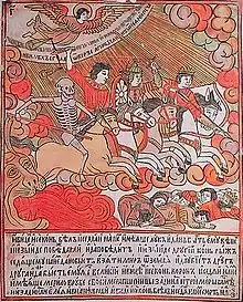 Тема Четырех всадников является одним из самых популярных апокалиптических сюжетов вообще, однако как самостоятельный мотив она появляется достаточно поздно. В средневековых миниатюрах каждый из всадников изображался сам по себе, на отдельном листе (изредка лишь в испанских «Беатусах» их иногда изображают на одной странице). Ситуация меняется в позднее Средневековье и с началом эпохи Возрождения (например, Дюрер соединяет их на одном листе, 1498 год), с распространением печатных книг с гравированными иллюстрациями. Совместная скачка четырех всадников возникает во фресковых циклах и в религиозных картинах, а в XIX веке уже как независимые произведения. Бенджамин Уэст разрабатывал тему и в классицистической, и в позднебарочной эстетике. Четыре всадника приобретают совершенно независимую трактовку у светских живописцев (Уильям Тернер, Фредерик Уоттс, А. Беклин). Эффектное воплощение темы находим в творчестве Виктора Васнецова в эскизах к неосуществленным росписям Киевского собора[3][4]. Встречаются и скульптурные работы на этот сюжет.