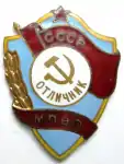 - Нижняя часть флага закрывается кругом, диаметр которого 1,5 см, покрытым белой эмалью. В нижней части окружности белого круга надпись «Отличник», а в ерхней части серп и молот.
