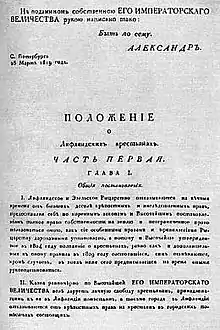После долгих дебатов в апреле 1817 года Курляндский ландтаг принял решение об освобождении крестьян, которое было утверждено 25 августа 1817 года и объявлено на торжественной церемонии в присутствии императора Александра I 30 августа 1818 года в Митау. Закон об освобождении крепостных Курляндии формально предоставил личную свободу и свободу передвижения для 300 000 человек. 26 марта 1819 г. был принят аналогичный закон, разработанный Лифляндским ландтагом, обнародованный 6 января 1820 г. в Риге и на Эзеле[3]. Однако отмена крепостничества была постепенной, был установлен так называемый временный статус. После освобождения крестьян предусматривалось также изменение низшей административной структуры[3].