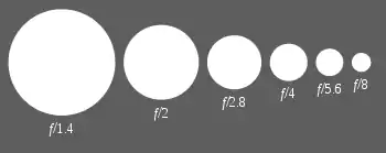 В этом случае знаменатель относительного отверстия называют диафрагменное число или «число диафрагмы». Диафрагменное число вычисляется как отношение фокусного расстояния объектива к диаметру его входного зрачка и обозначается цифрой. Диафрагменное число является величиной, обратной относительному отверстию[5][6].