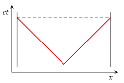 Может быть полезно визуализировать эту ситуацию, используя пространственно-временные диаграммы. Для данного наблюдателя ось t определяется как точка, продолженная вертикально во времени от начала пространственной координаты x. Ось x определяется как совокупность всех точек пространства в момент времени t=0 и продолженная горизонтально. Утверждение о том, что скорость света одинакова для всех наблюдателей, отражается путём рисования светового луча как линии под углом 45°, независимо от скорости источника относительно скорости наблюдателя.