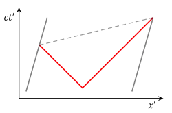 На первой диаграмме оба конца поезда изображены серыми линиями. Поскольку концы поезда неподвижны относительно наблюдателя в поезде, эти линии являются строго вертикальными линиями, показывающими их движение во времени, но не в пространстве. Вспышка света показана в виде красных линий под углом 45°. Точки, в которых эти две световые вспышки попадают в концы поезда, находятся на диаграмме на одном уровне. Это означает, что события одновременны.