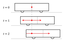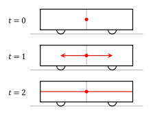 Популярная картина для понимания этой идеи обеспечивается мысленным экспериментом, подобным тому, который был предложен Комстоком в 1910 году[14] и Эйнштейном в 1917 г.[15][12] Он также состоит из одного наблюдателя в середине скоростного вагона и другого наблюдателя, стоящего на платформе, когда поезд движется мимо.