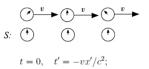 Предположим, что рядом с каждыми часами в обеих системах отсчёта находятся наблюдатели. Положив в преобразованиях Лоренца , получаем . Это означает, что наблюдатели в системе , одновременно с совпадением времени на центральных часах, регистрируют различные показания на часах в системе . Для наблюдателей, расположенных справа от точки , с координатами , в момент времени часы неподвижной системы отсчёта показывают «будущее» время: . Наблюдатели , находящиеся слева от , наоборот, фиксируют «прошлое» время часов : . На рисунках выше положение стрелок символизирует подобную разницу показаний часов двух систем отсчёта.