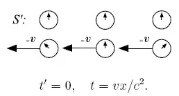 Относительность одновременности событий является ключевым эффектом СТО, проявляющимся, в частности, в «парадоксе близнецов». Рассмотрим несколько синхронизированных часов, расположенных вдоль оси в каждой из систем отсчёта. В преобразованиях Лоренца предполагается, что в момент времени начала систем отсчёта совпадают: . Ниже изображена такая синхронизация отсчёта времени (на «центральных» часах) с точки зрения системы отсчёта (левый рисунок) и с точки зрения наблюдателей в (правый рисунок):
