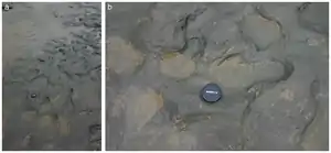 Обнажившаяся поверхность исследовалась на протяжении двух недель с использованием методов фотограмметрии, позволяющих создание трёхмерных изображений. Анализ полученного материала подтвердил первоначальное предположение о том, что речь идёт о следах древних людей — вероятно, пяти разных особей[2]. Обнаруженные следы, по всей видимости, принадлежат людям разного возраста и пола (исходя из соотношения длины стопы к росту как 0,15:1, рост оставивших следы людей мог варьироваться от 93 см до 1,7 м)[1]. В некоторых случаях можно отчётливо рассмотреть отпечатки пятки, свода стопы и даже пальцев[2], показывающие, что следы ведут на юг. Форма отпечатков, относительно более широких, чем известные из Кении следы Homo erectus и парантропа Бойса, совпадает с оценками, сделанными для ступней древнейшего европейского гоминида Homo antecessor[1].