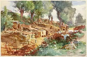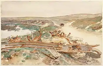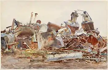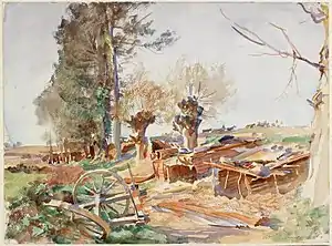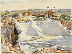 Некоторое время Сарджент находился в расположении Гвардейской дивизии возле Арраса, а затем выехал вместе с Американскими экспедиционными силами в район Ипра. Он был полон решимости написать эпическое полотно со множеством человеческих фигур и изо всех сил старался найти сюжет, в котором были бы задействованы американские и английские солдаты[1][4][6]. Сарджент ежедневно тратил многие часы на поиски интересных с художественной точки зрения сцен, зарисовывая всяческих солдат, лежащих, спящих, купающихся, марширующих и едящих, так и не сумев отразить на полотне боль или мучения войны[13]. Абсолютно ничего не зная о военной службе и делах на фронте, он удивлял всех своими вопросами о том, воюют ли по воскресеньям, а также не обращал совершенно никакого внимания на возможную опасность, когда рисовал на мольберте под большим белым зонтом, который прикрывал художника от солнца и одновременно делал заманчивой мишенью для немецких орудий[1]. У Сарджента того времени можно выделить всего несколько работ, лишь частично затрагивающих тему войны и оттого не показавших всей её горечи, потери для всего его поколения той изысканной и приятной, довоенной жизни[13]. Среди них (Имперский военный музей) — «На улице в Аррасе»[17]: пехотинцы отдыхают рядом со обрушившейся стеной чьего-то частного особняка[13]; «Разбившийся аэроплан»[18]: фермер ходит по своему полю и собирает урожай, не обращая совершенно никакого внимания на лежащие за его спиной обломки биплана[13]; «Разрушенный сахарный завод»[19]: сахарный завод в результате бомбардировки превратился в какого-то жестоко изуродованного железного зверя[13]. Из того же ряда — «Дорога в выемке на Рансар»[20], «Старые биваки»[21], «Брезент над землянкой, Рансар»[22], «Развороченный танк»[23], «Ворота шато, Рансар»[24], «Строй лошадей»[25].
