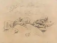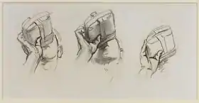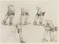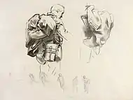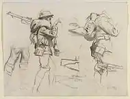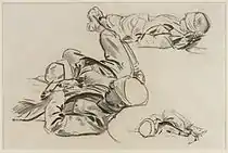 | Спящий на вещмешке солдат | Санитары ведут раненых | Стоящие с винтовками солдаты | Лежащие раненые солдаты | Солдат с вещмешком | Зарисовки пьющих воду солдат | Пять пар ног | Лежащие солдаты | Лежащий солдат |