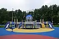 На территории обустроена большая детская зона с тремя тематическими площадками. На первой площадке разместили лазательные игровые комплексы и качели-гнезда. Вторая площадка выполнена в тематике авиации – здесь находятся игровой комплекс в виде здания аэропорта, качели и горки в виде самолетов и вертолетов. Третья площадка посвящена космосу – горки, песочницы и качалки на ней имитируют ракеты, спутники и луноходы.
