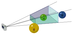 Аналогично, в трёхмерной графике, сцена может состоять из объектов (обычно треугольников), расположенных со всех сторон виртуальной камеры, но программе достаточно рендерить только те объекты, которые находятся в поле зрения. В трёхмерной графике, это нетривиальная задача. Для каждого треугольника в сцене требуется определить, входит он в поле зрения или нет. Если треугольник частично входит в поле зрения, то часть его придётся отсечь.