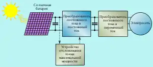 Принцип работы устройства ОТММ заключается в непрерывном измерении выходных характеристик источника и изменении отбираемого тока, передаваемого в нагрузку, которой обычно служит вход инвертора, для получения максимальной мощности при изменении нагрузочных характеристик источника энергии.