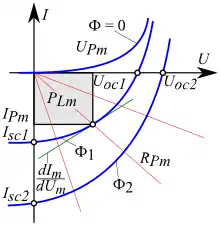 Пример семейства ВАХ фотогальванической ячейки при разных световых потоках приведён на рисунке. Фотогальваническому режиму, то есть режиму, при котором фотогальваническая ячейка отдаёт мощность в нагрузку, соответствует 4-й квадрант ВАХ. При фиксированных условиях и при любой нагрузке рабочая точка фотогальванического режима, определяемая координатами , лежит на линии ВАХ в 4-м квадранте, где фотогальваническая ячейка работает как генератор энергии[2]. При этом мощность , отбираемая от ячейки, будет: , где — соответственно напряжение и ток в рабочей точке.