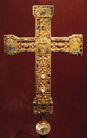 Для оттоновского периода характерно изготовление многочисленных предметов церковной утвари из золота (или с позолотой) с украшениями из драгоценных камней, кристаллов, камей, а также рисунков, выполненных эмалями, будь то кресты, реликварии, алтарные фронталы или обложки для богослужебных книг[23]. Церковная утварь такого рода изготавливалась давно, но утварь оттоновского периода имеет свои отличительные черты, в частности, украшение поверхностей в виде драгоценных камней на специальных золотых подставках в обрамлении золотой проволоки, а также рельефами в металлопластике, отделанными золотом между эмалевыми изображениями и отделкой из драгоценных камней. В этот период церковные атрибуты приобретали всё большее значение, в том числе политическое, поэтому для их хранения были изготовлены богато украшенные вместилища[24]. В церковной утвари такого рода драгоценные камни не только создают впечатление богатства, но и служат тому, чтобы создать впечатление о грядущем Новом Иерусалиме, а отдельным видам драгоценных камней в популярных книгах того времени приписывается множество магических и медицинских свойств[25]. Немногие сохранившиеся образцы светских украшений оттоновского периода имеют схожие черты, например, корона, которую Оттон III носил в детстве, а затем подарил золотой мадонне Эссена[26].
