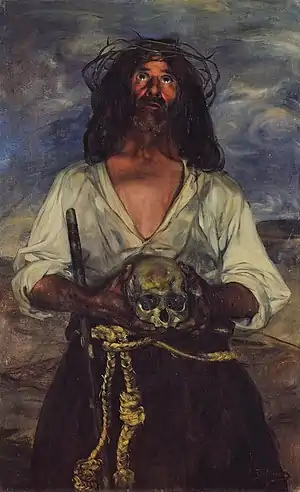 На картине изображён длинноволосый мужчина с короткой бородой, в белой рубахе и тёмно-коричневых штанах. На его голове терновый венец, в руках он держит человеческий череп и придерживает локтем посох, подпоясан грубой верёвкой. В левой нижней части намечен контур корзины, оставшейся недописанной. Справа внизу стоит подпись художника: I. Zuloaga.