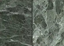 - Офикальцит прожилковатый (Ophicalce veinée): характеризуется различными по размеру и форме пятнами белого известняка серого или красноватого цвета, разделенных зелеными прожилками талька и серпентина, и также белыми известняковыми нитями. Также известен как древний или античный зелёный мрамор (Verd antique, verde antico). Месторождения: Египет, Сарранколин (Пиренеи), Фирми и Кассань возле Наджака, Савеньер в Мэн-и-Луара, горы Санта-Мария неподалеку от города Флоренция, Лавазера, близ залива Специя возле города Генуя, в городе Нью-Хейвен, Коннектикут (США) и др.