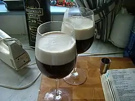 «Кофе по-ирландски» | ирл. Caife Gaelach | Горячий кофейный напиток, который относят в категорию коктейлей со сливками, на основе Ирландского виски, чёрного кофе, взбитых сливок и коричневого сахара. Метод приготовления: билд[84][85]. |