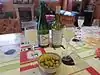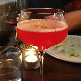 «Кир» | фр. Kir | Коктейль-аперитив на основе белого сухого вина и чёрносмородинового ликёра Creme de Cassis, изобретён в Бургундии (Франция). Метод приготовления: билд[80][81]. |