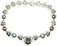 Ажурная цепь с исторической реликвией — ладанкой, которая, согласно легенде, принадлежала украинскому гетману Мазепе, а также была среди атрибутов президента УНР в изгнании. Семь медальонов нагрудного знака президента расписаны вручную. На них в миниатюре изображены золотой княжеский трезубец, трезубец Владимира-Крестителя, золотой галицкий Лев (герб Галицко-Волынского княжества), герб «Погоня» (герб Великого княжества Литовского, в состав которого входили украинские земли), герб «Рыцарь с самопалом» (символ Гетманщины, Украинского казацкого государства), герб «Абданк-Сырокомля» (родовой герб Богдана Хмельницкого, под властью которого в XVII веке Украина объединилась в сильное казацкое государство), и герб Украинской Народной Республики как первой попытки образования независимой Украины в XX веке.