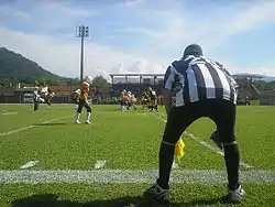 Дословно судья. На поле располагается в 4-5 ярдах за линией скримеджа на стороне защиты и следит за соблюдением правил при контактах между игроками нападения и защиты на линии скриммеджа. Во время паса он продвигается к линии скримедж, так как игра развивается, чтобы (1) наказать всех линейных игроков атаки, которые незаконно перемещаются вниз по полю, прежде чем будет сделан бросок, или (2) наказать квотербека за бросок мяча, если он пересечёт линию скримеджа. Он также помогает в определении не пойманного паса, когда бросок мяча делается на небольшую дистанцию. В дополнение к своим полевым обязанностям отвечает за легальность всей экипировки игроков.