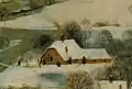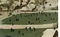 Лежащая внизу долина заполнена замерзшей рекой и искусственным прудом, видны деревеньки с остроконечными церквями, мельница с обледенелым колесом. Несмотря на зимний и хмурый день, долина заполнена людьми. Кое-кто занимается хозяйственными делами, возит на телеге или носит хворост. У моста из трубы дома валит огонь, один человек уже забрался на крышу тушить пожар, другие спешат с лестницами на помощь. А в это время остальные развлекаются на пруду, катаясь на коньках и санках, или играют в аналоги гольфа, кёрлинга или хоккея.