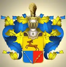 В щите, разделенном горизонтально надвое, в верхней половине в золотом поле изображен олень, бегущий в правую сторону (изм. польский герб Брохвич). В нижней половине в правом голубом поле, означена серебряная стрела, а в левом красном поле золотой лук (изм. польский герб Лук).