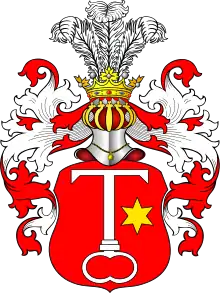 Щит увенчан дворянскими шлемом и короной. Нашлемник: три страусовых пера. Намет на щите красный, подложенный серебром.