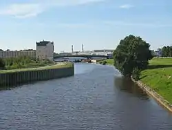 Охта при впадении в Неву, над устьем Малоохтинский мост. На левом берегу месторасположение бывшей шведской крепости Ниеншанц, на правом берегу месторасположение бывшего шведского города Ниенштадт. | |
