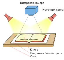 - Обязательный: получение копий страниц в виде графических (обычно растровых) изображений, осуществляемое путём сканирования или фотографирования с последующей обработкой и сохранением в одном из форматов графических файлов. В этом случае полностью сохраняется оригинальная вёрстка книги и исключаются какие-либо ошибки, однако, невозможен поиск или извлечение фрагментов текста для, например, целей цитирования.