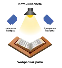 Профессиональные книжные сканеры сканируют оригиналы в высоком качестве с использованием двух цифровых камер и источников света по обе стороны от камеры, что позволяет переснять разворот книги за один раз. Преимущество таких сканеров — высокая скорость съёмки, а также отсутствие необходимости раскрывать книгу на 180 градусов. Однако цены таких сканеров обычно начинаются с 10 000$.
