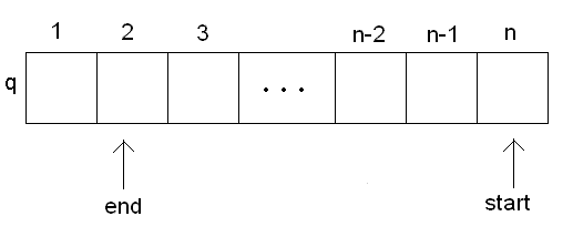 Обычно start указывает на голову очереди, end — на элемент, который заполнится, когда в очередь войдёт новый элемент. При добавлении элемента в очередь в q[end] записывается новый элемент очереди, а end уменьшается на единицу. Если значение end становится меньше 1, то мы как бы циклически обходим массив, и значение переменной становится равным n. Извлечение элемента из очереди производится аналогично: после извлечения элемента q[start] из очереди переменная start уменьшается на 1. С такими алгоритмами одна ячейка из n всегда будет незанятой (так как очередь с n элементами невозможно отличить от пустой), что компенсируется простотой алгоритмов.