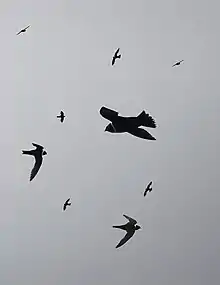 При приближении новой птицы к занятому насесту сидящие стрижи поднимают одно или два крыла, демонстрируя агрессивное поведение и не давая птице сесть. При этом пара птиц поднимает внешние по отношению друг к другу крылья[18]. Приближающаяся к насесту птица обычно громко кричит. Следом за её криками, отличающимися от позывок в стае, начинают шуметь сидящие на насесте стрижи. Обычно стриж принимает свою пару и быстро успокаивается после того, как вторая птица устраивается на насесте. Если же стрижа отогнали, он устраивается на незанятое место рядом или улетает после нескольких безуспешных попыток[18].