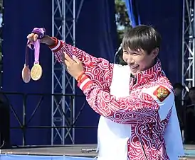 ![]() Михаил Оюн показывает свои медали Паралимпиады-2012 | |